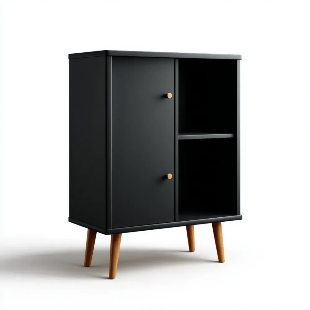 Material y ArtesaníaFabricado en madera de alta calidad, presenta un acabado en color Negro con patas de madera natural que aportan un toque elegante.