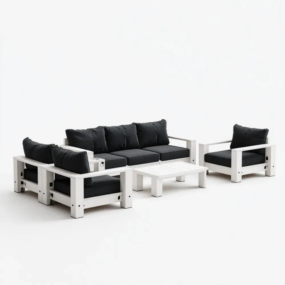 Material y fabricaciónEstructura de aluminio resistente con cojines de poliéster en colores Blanco y Negro, diseñados para resistir las condiciones exteriores.